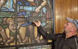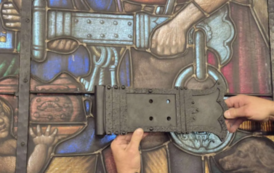 Montaż zawiasów wzorowanych na tych z witraży w szczecineckim ratuszu wieńczy wymianę magistrackich drzwi.