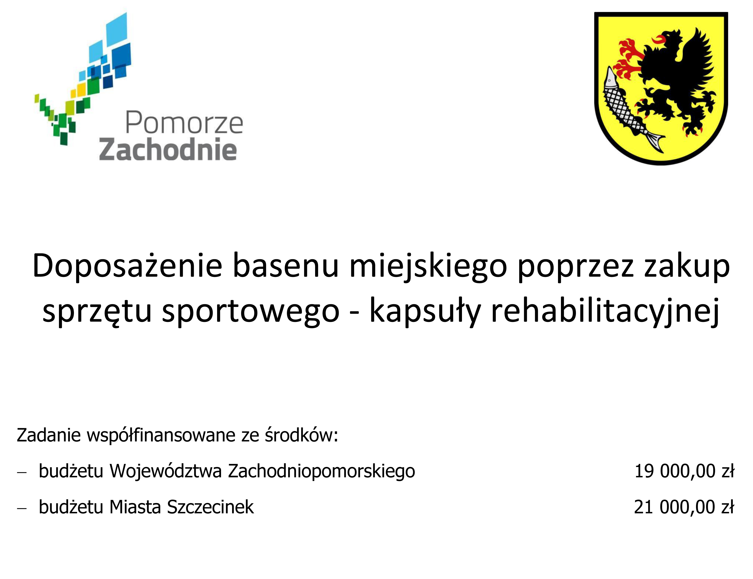 Zakup specjalnej kapsuły rehabilitacyjnej, pomocnej dla osób zarówno wymagających rehabilitacji, ale również dla dzieci i młodzieży, która będzie miała możliwość regularnych ćwiczeń i zajęć sportowych w kapsule na basenie miejskim. Kapsuła rehabilitacyjna to szczelna wanna wypełniona wodą, w której można uprawiać dwa rodzaje sportów, a mianowicie bieganie i jazdę na rowerze. Wanna podzielona jest na dwie strefy: relaksu oraz ćwiczeń. Strefa ćwiczeń została stworzona do zajęć z bieżnią lub rowerem. Z racji tego, że Basen Miejski doposażony jest w rowery wodne, które można umieścić w kapsule, optymalnym rozwiązaniem był zakup kapsuły z bieżnią. Trening w kapsule wspomagany jest przez 6 dysz generujących dodatkowy opór. Strefa relaksu to komfortowe siedzisko, wyposażone w 12 dysz dla wyciszenia po treningu. AQUA Rehab jest rekomendowany przez fizjoterapeutów jako efektywny i bezpieczny trening przy nadwadze i otyłości, a także zredukowanej mobilności, po urazach kości i stawów, jako element rehabilitacji.